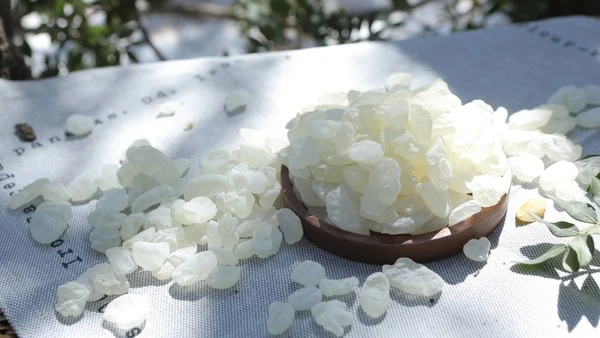 매스틱검은 그리스 키오스 섬에서 자라는 매스틱 나무의 수액을 건조해 굳힌 알갱이로, '신의 눈물'이라고도 불립니다. 매스틱 나무는 5년 정도 자라면 수액을 분비하기 시작하며, 7월부터 8월 사이에 수액이 가장 많이 나옵니다. 수확자들은 나무를 살짝 베어 수액이 흘러나오게 하고, 이를 거름망에 담아 건조시켜 알갱이 모양으로 만듭니다. 이렇게 만들어진 매스틱검은 투명하고 단단한 결정체로, 씹으면 부드럽고 유연해지며 살짝 달콤한 향이 납니다. 매스틱검은 고대부터 치료제로 사용되어 왔으며, 고대 그리스 의학의 아버지인 히포크라테스는 매스틱검을 소화제로 처방하였다고 합니다.